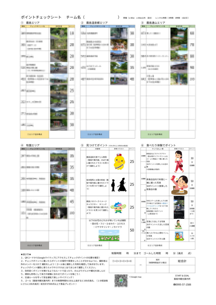 ゲーム開始時にお渡しするポイントチェックシート(ポイント場所のネタばれ防止の為、一部モザイク処理しております)